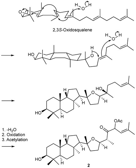 The plausible biosynthesis route of the obtained isomalabaricanes presented in Figure 4. The main isomalabaricane 6/6/5 carbocyclic skeleton might be derived from 2,3S-oxidosqualene through hydroxylation and electrocyclizations. The attached tetrahydrofuran moiety and the subsequent side chain were suggested to go through a hydroxylation, an electrocyclization, dehydration, oxidation, and acetylation, forming the first identified isomalabaricane with tetrahydrofuran functionality.