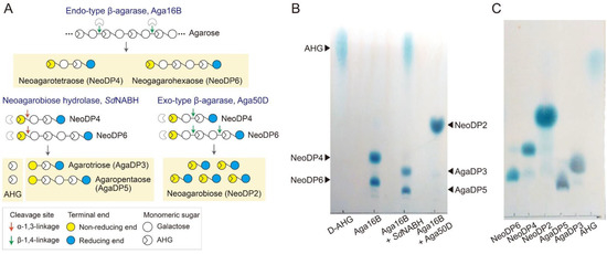 - Yu, S.; Yun, E.J.; Kim, D.H.; Park, S.Y.; Kim, K.H. Dual agarolytic pathways in a marine bacterium, Vibrio sp. strain EJY3: Molecular and enzymatic verification. Appl. Environ. Microbiol. 2020, 86, e02724-19. [Google Scholar] [CrossRef]