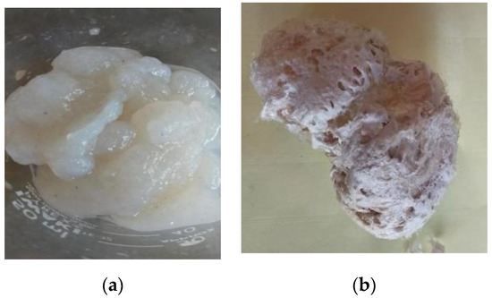 (a) Wet and (b) lyophilized collagen samples (pepsin-soluble collagen, the extracted collagen with the highest yield).