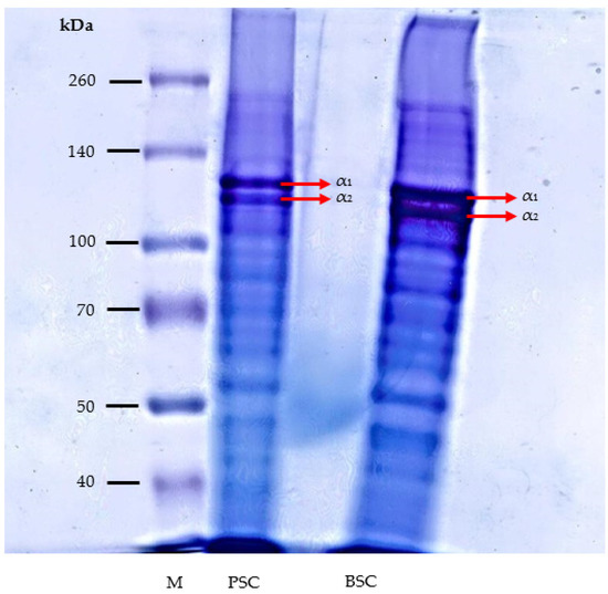 SDS-PAGE patterns of pepsin-soluble collagen and bromelain-soluble collagen from bigeye tuna skin. M, PSC, and BSC are high protein markers, pepsin-soluble collagen, and bromelain-soluble collagen, respectively. Arrows show the collagen bands.