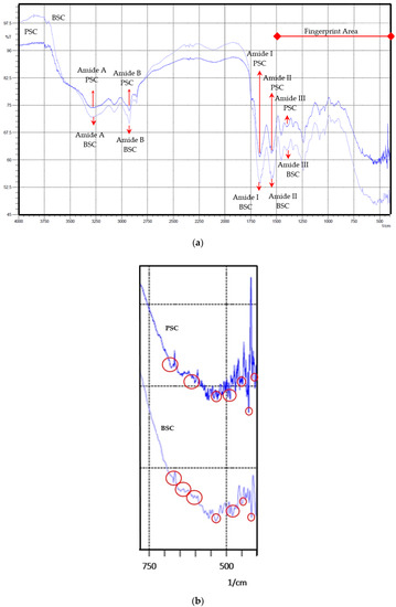The infrared spectra of collagen samples (a) and fingerprint area magnification of the infrared spectra of collagen samples (b). The x-axis represents the wave number (W) and the y-axis represents the percentage of transmittance (%T). PSC and BSC are pepsin-soluble collagen and bromelain-soluble collagen, respectively. The fingerprints distinguishing between PSC and BSC are shown in the circled areas.