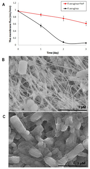 The effect of YtnP on the biofilm formation of P. aeruginosa and the permeability of filter membrane were tested on the simulated water filter system. As shown in Figure 5A, treatment of the QQ enzyme significantly inhibited the biofouling of P. aeruginosa on the PTEE membrane, and the experimental group treated with a free YtnP solution retained about 63.34% membrane flux after 3-day incubation, while the membrane without the QQ enzyme was rapidly blocked by the biofilm formed by P. aeruginosa in 2 days and remained only 6.05% on capacity of permeability after 3 days. The SEM images of the fouling layers on simulated water filter system, as shown in Figure 5B,C, were also prove the antifouling capacity of YtnP against P. aeruginosa. The results demonstrated that QQ enzyme treatment could be used as an effective strategy to relieve bacterial contamination and biofilm pollution on water filter in dental units.