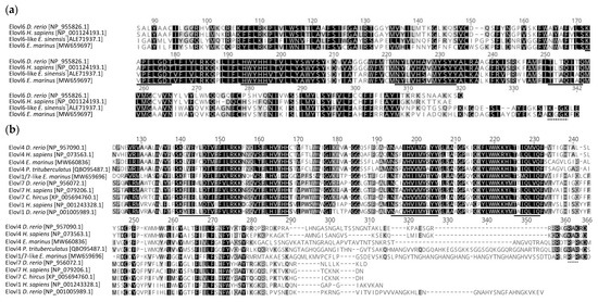 Alignments of the partial deduced amino acid (aa) sequences from the Echinogammarus marinus (a) SFA/MUFA like elongase elovl6 (MW659697) and (b) PUFA-like elongases elovl4 (MW660836) and elovl1/7-like (MW659696), with several elongases already characterised from vertebrates and crustaceans including the swimming crab P. trituberculatus. Conserved domains KXXEXXDT, NXXXHXXMYXYY and TXXQXXQ, and the histidine box (HXXHH) are underlined (solid line). Additionally, aa residues corresponding to putative endoplasmic reticulum retention signal have a dotted underline.