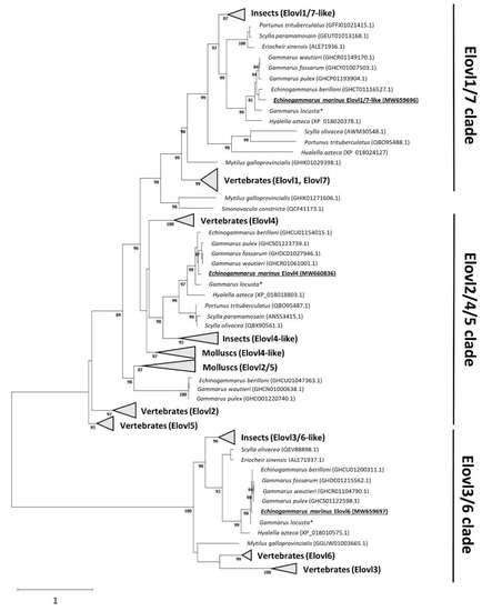 Phylogenetic tree comparing gammarid Elovl with several elongases retrieved from other crustaceans, as well as molluscs and vertebrates. There are three different clades that grouped the majority of the sequences analysed, namely Elovl1/7 clade, Elovl2/4/5 clade and Elovl3/6 clade. Two sequences that do not correspond to any of the previously defined clusters are PUFA elongases found in Mytilus galloprovincialis and Sinonovacula constricta [43]. The protein evolutionary model used was LG4X [44]. The tree was constructed using the maximum likelihood method by randomized axelerated maximum likelihood (RAxML) within the CIPRES external server. Confidence in the resulting phylogenetic tree branch topology was measured by bootstrapping through 1000 iterations. The transfer distance bootstrap support value (%) is given in each node. Values lower than 80% are not shown. Accession numbers according to the NCBI database are given for each sequence. * Elovls from Gammarus locusta were retrieved from blasting the transcriptome assembled by Neuparth et al. [45].