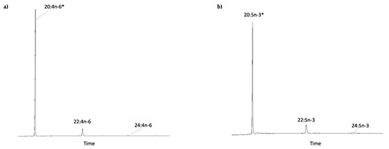 Functional characterisation of the E. marinus Elovl1/7-like activity towards C20 PUFA substrates. Yeast (S. cerevisiae) expressing the E. marinus elovl1/7-like gene was grown in the presence of (a) arachidonic acid (ARA) (20:4n-6) and (b) eicosapentaenoic acid (EPA) (20:5n-3). Substrates (*) and their corresponding elongation products are indicated in each panel.
