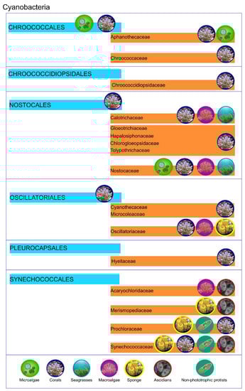 Symbioses of cyanobacteria. In this figure are summarized the symbioses among different cyanobacteria taxa with different hosts.