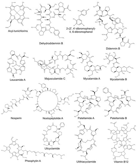 - Sings, H.L.; Rinehart, K.L. Compounds produced from potential tunicate-blue-green algal symbiosis: A review. J. Ind. Microbiol. Biotechnol. 1996, 17, 385–396. [Google Scholar] [CrossRef]