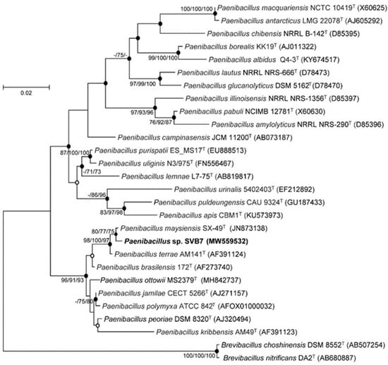 Maximum likelihood phylogenetic tree showing the position of Paenibacillus sp. SVB7. Bootstrap values (expressed as percentages of 1000 replications) over 70% are shown to the left of the node, and represent maximum likelihood, neighbor-joining, and minimum evolution (reading from left to right). Filled and open circles at each node indicate nodes recovered by all three treeing methods or by two treeing methods, respectively. Two 16S rRNA gene sequences of the genus Brevibacillus were used as outgroups. Bar, 0.02 substitutions per nucleotide position.