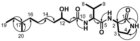 The interpretation of COSY, TOCSY, and HMBC NMR spectra enabled us to determine the partial structures of 1. First, the 2-NH (δH 8.10)/H-2 (δH 4.30) COSY correlation connected 2-NH to the C-2 α-carbon (δC 49.4). The TOCSY and COSY correlations among H-2, H-3a and H-3b (δH 1.82 and 2.26), H2-4 (δH 3.16), and 4-NH (δH 7.78) secured the spin system from 2-NH to 4-NH. The HMBC correlations from 4-NH to C-1 (δC 174.2), C-2 (δC 49.4), C-3 (δC 28.0), and C-4 (δC 38.0), and from 2-NH to C-1 (δC 174.2), led to elucidation of the substructure as a 3-amino-2-pyrrolidinone. The structure of valine was assigned based on the 1H–1H couplings of 6-NH (δH 7.83), H-6 (δH 4.18), H-7 (δH 1.96), H3-8 (δH 0.84), and H3-9 (δH 0.88) in the COSY and TOCSY NMR spectra along with the H-6/C-5 (δC 171.0) HMBC correlation. The remaining part of the molecule was composed of a lipophilic acyl chain. The protons in the substructure from C-11 to C-20 belong to a single spin system as revealed by COSY/TOCSY correlations of the protons. These protons showed correlation peaks with an exchangeable proton at δH 4.65 in the TOCSY spectrum, indicating that the exchangeable proton is also included in the spin system (Figure 3).