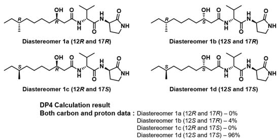 The 3-hydroxy-8-methyldecanoic acid moiety contained stereogenic centers at C-12 and C-17. Initially, the modified Mosher’s method was applied for the oxygen-bearing chiral center at C-12. However, multiple esterifying attempts at the hydroxy group by S- and R-MTPA-Cl were not successful. Therefore, DP4 calculation was used to determine the absolute configurations. Four possible diastereomers of 3-hydroxy-8-methyldecanoic acid of svalbamide A (1), namely 1a (12R and 17R), 1b (12S and 17R), 1c (12R and 17S), and 1d (12S and 17S), were constructed with the established 2R and 6R configurations (Figure 4). Following this, the 1H and 13C chemical shifts of 158 conformers were calculated and averaged with their Boltzmann populations. Our DP4 calculations, based on statistical comparisons of the calculated and experimental chemical shifts, indicated that the diastereomer 1d (12S and 17S) was suitable for svalbamide A (1) with 96.0% probability (Figure 4). The absolute configuration of svalbamide B (2) was subsequently proposed as 2S, 6R, 12S, and 17S.