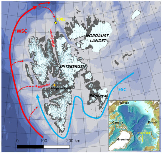 Map of the Svalbard archipelago with the core site and the main currents influencing Svalbard highlighted. The red and blue arrows indicate the West Spitsbergen Current (WSC) and East Spitsbergen Current (ESC), respectively, and the yellow rectangle indicates the coring site (HH17-1085-GC). The shaded white color represents the present glacier-covered areas on the archipelago.