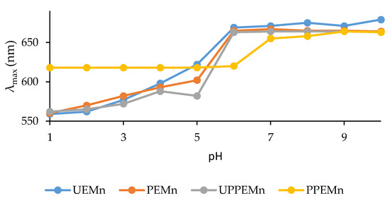 Evolution of maximum absorption wavelength (λmax) of marennine between 500 and 750 nm: maximum wavelength (nm) corresponding to pH values. Ultrafiltrated marennine (UEMn); Precipitated marennine (PEMn); Unretained Precipitated Purified marennine (UPPEMn); Purified Precipitated marennine (PPEMn).