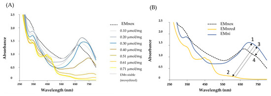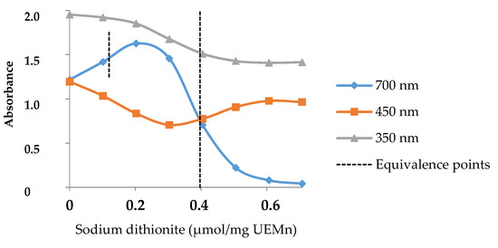 The shoulders at 350 and 450 nm, which fluctuated, and the peak at 700 nm were chosen. Curves at 450 and 700 nm showed a first equivalent point at 0.12 µmol/mg of UEMn, which points out the transition from the initial EMn state to a more blue-green state. The second equivalent underlined by the three curves point at 0.40 µmol/mg indicated the clear shift from this state to the yellow form, and 0.61 µmol/mg of dithionite allowed a complete reduction of EMn. Therefore, three states of EMn can be described: a first initial or native state that corresponds to the oxidized form (EMnox), a second intermediate one (more blue, EMni), and a third reduced and yellow state (EMnred). Dithionite induced two reduction steps, which require—under the assumption of a molecular mass of 10 kDa [21]—less than 6 molecules of dithionite per EMn to obtain the yellow form, including 3 for the intermediate form. At least two redox couples are present: EMnox/EMni and EMni/EMnred.
