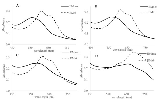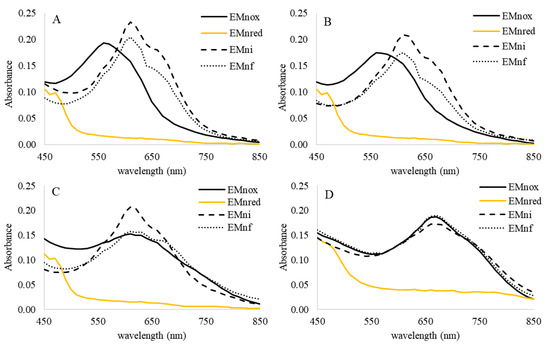 Given the differences observed on the spectrum as a function of pH, the behavior of EMn was also followed in more acidic pH. Spectrophotometric analysis in the range of pH 4 to 10 demonstrated the reversibility of the reduction with sodium dithionite (Figure 4). Since dithionite is not stable at acidic pH [26], the experiments were carried out by adding an excess of dithionite and followed in a 96-well plate. A control at pH 7.5 was maintained to compare the two methods. Despite some little color differences, UEMn, and PPEMn displayed the same behavior in presence of this reductant. Yellowing (EMnox) was observed at acidic pH (Figure S1 and Figure 4) but the reoxidation (EMni) was indeed markedly faster at acidic pH: 10, 12, and 15 min at pH 2, 3, and 4, respectively, against 20 min at pH 7.5. Unlike at pH 7.5, where the spectrum of the reoxidized form is close to the initial form (with an increase in absorbance at 600–800 nm and a slight bathochromic effect), at pH 2 and 3, a net shift of the λmax is observed from 560 nm to 610 nm from EMnox to EMni, respectively, with an increase in absorbance (Figure 4A,B) and a color change from purple to blue. At pH 4, only the increase in absorbance is observed (λmax remains at 610 nm; Figure 4C). At pH 7.5, under these conditions the spectra are similar (λmax = 670 nm; Figure 4D). The pattern of the control, marennine without addition of dithionite (EMnf), was also followed. The spectra of EMnf at pH 4 and 7 were not modified (EMnf ≈ EMox), unlike at pH 2 and 3, whose λmax moved as in the presence of dithionite from 560 to 610 nm (EMnf ≈ EMni) (Figure 4). The redox potential of EMnox/EMni is therefore dependent on the pH and the protonation state of the EMn. The EMnox/EMni in acid form (pH < pKa) seems to have a higher potential than the basic forms (pH 7.5), above the pKa previously determined at 4.74 [21]. EMnox at low pH is an oxidant in oxygenic conditions.