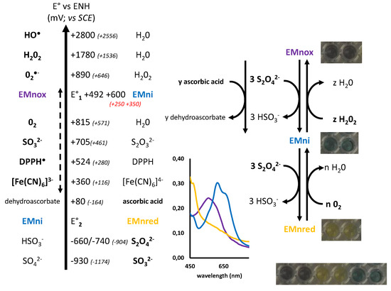 The comparison of the standard redox potential (E° vs. ENH, 25 °C) of the various reducing agents and the reactions observed makes it possible to propose a first redox potential (E°1) of the EMnox/EMni couple between +1780 mV (H2O2/H2O) and +815 mV (O2/H2O) for pH below pKa, and between +815 mV (O2/H2O) and + 80 mV (dehydroascorbate/ascorbic acid) for pH above pKa. Indeed, the EMni state is not reoxidized in the presence of oxygen but with oxygen peroxide and at pH below pKa, EMnox is reduced to EMni. EMnox and EMni are reduced by dithionite (HSO3−/S2O42−; E° = −660/−740 mV) but yellowing is not observed by addition of ascorbic acid (dehydroascorbate / ascorbic acid; E° = + 80 mV). Therefore, E°1 is above +80 mV. Moreover, a second redox potential (E°2) of EMni/EMnred must be between +80 and −660/740 mV. These data are summarized in Figure 6. The E°1 data were determined by electrochemical experiments (see Section 2.5).