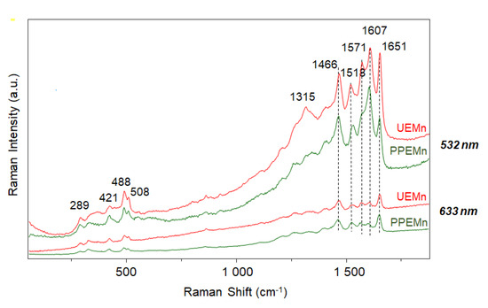 Micro-Raman spectroscopy is a powerful non-destructive technique for revealing differences between uncommon biomolecules. Compared to other spectroscopic techniques, Raman spectroscopy needs a small amount of matter and limited sample preparation and offers a high spectral resolution and narrow spectral bands. In the case of colored compounds, the Resonance Raman (RR) spectroscopy can help to reveal an intensity enhanced spectrum from a chromophore without observing any contribution from a complex biological system [10,20,32,33]. By adjusting the incident wavelength of the laser illumination, it is possible to both reveal peaks in the Raman spectrum related to specific vibrational modes of functional groups (even at low concentration) and limit the intrinsic fluorescence background. The highest signal-to-noise spectra of marennine (Figure 7) were recorded using a green excitation (532 nm, Nd: YAG laser). The Raman spectra of UEMn and PPEMn are similar with well-resolved bands between 1200 and 1700 cm−1 and between 200 and 600 cm−1. The interpretation of RR spectrum is usually not trivial since the intensity of the peaks and the peak positions of the chromophores are characteristic of both vibrational and electronic properties. Nevertheless, it is admitted that the marker bands can provide an interesting insight into the electronic behavior of chromophore when environmental conditions are modified.