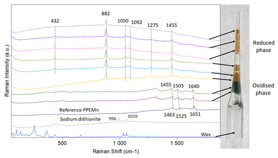 As previously shown, the introduction of sodium dithionite into the marennine solution can cause a yellowing of the solution, likely due to the formation of a reduced state of the chromophore. Consequently, it was decided to make a homemade sealed glass cell in order to stabilize the reduced phase long enough to collect the Raman vibrational bands associated with this electronic state. Several attempts were necessary to successfully change the color of the marennine powder without going into a liquid form, which resulted systematically in a strong increase of the fluorescence background. In Figure 8, the homemade glass cell is presented and, for the first time, the spectrum of the marennine in its reduced phase; the main well-resolved characteristic bands are observed at 432, 882, 1050, 1092, 1275, and 1455 cm−1. These results clearly show that the appearance of these new Raman peaks is associated with the color change and, interestingly, the strong peaks located at 1651, 1607, and 1571 cm−1 in PPEMn were no longer visible in the reduced form of marennine, probably due to the strong fluorescence baseline.