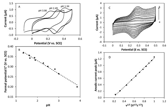 (A) Cyclic voltammograms recorded at 100 mV s−1 on a glassy carbon electrode in phosphate buffer marennine solutions (1 mg mL−1) at different pH. (B) Plot of the formal potential vs. solution pH. (C) Cyclic voltammograms recorded on a glassy carbon electrode in a phosphate buffer solution (pH 3) containing marennine (1 mg mL−1) at different scan rates: (a) 50 mV s−1, (b) 100 mV s−1, (c) 200 mV s−1, (d) 300 mV s−1, (e) 400 mV s−1, (f) 500 mV s−1, (g) 600 mV s−1, (h) 700 mV s−1, (i) 800 mV s−1, (j) 900 mV s−1, and (k) 1000 mV s−1. (D) Plot of the anodic current peak intensity vs. the square root of the scan rate.