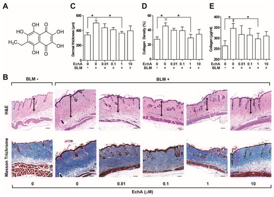Dose-dependent effects of EchA treatment on tissue fibrosis in a scleroderma mice model. (A) Chemical structure of EchA. (B) Dose-dependent effect of Echinochrome A (EchA) on BLM-induced scleroderma. The BLM-induced scleroderma mice (BLM+) were treated with the increasing dose of EchA daily for an additional three weeks, and skin sections were stained using H&E and Masson’s trichrome staining kits. The dermal layer between the epidermal–dermal junction and the dermal–fat junction is indicated by an arrow on H&E-stained sections. Dermal thickness (C) and collagen density (D) were quantified from the H&E and Masson’s trichrome data, respectively. (E) Effect of EchA on the BLM-induced increase in hydroxyproline content in skin. Data represent the mean ± SD (n = 5 per group). * p < 0.05.