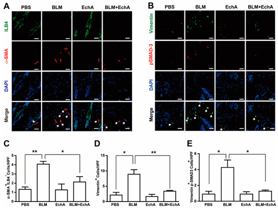 (A) EchA-induced inhibition of myofibroblast differentiation in scleroderma. The BLM-induced scleroderma mice were treated with or without 1-µM EchA for three weeks, and the mock-treated (PBS) and the scleroderma (BLM or BLM+EchA) skin specimens were immunostained with antibodies against α-SMA and ILB-4. (B) The skin specimens were stained with antibodies against vimentin and phospho-SMAD3. Scale bar = 50 μm. The numbers of α-SMA+ILB-4− (C), vimentin+ (D), and vimentin+phospho-SMAD3+ (E) cells were quantified under a high-power field. Data represent the mean ± SD (n = 4 per group). * p < 0.05, ** p < 0.01