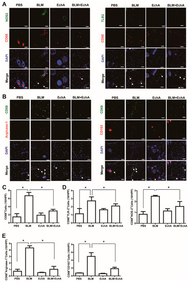 Inflammatory cell activation and infiltration into skin tissue has been reported to induce systemic sclerosis under chronic inflammation. To explore the effects of EchA treatment on inflammatory action associated with scleroderma, we measured the levels of macrophage infiltration and activation using immunohistochemistry analysis. The number of CD68-positive macrophages increased in the BLM-induced scleroderma skin compared with the control, and EchA co-treatment suppressed BLM-induced macrophage infiltration (Figure 3A,C). Activation of macrophages is known to induce polarization toward pro-inflammatory M1 macrophages or anti-inflammatory M2 macrophages [3]. Thus, we measured the numbers of M1 and M2 macrophages in the skin specimens by immunostaining. The number of M1 macrophages, which include CD68+TLR2+ and CD68+NOS2+ cells, were increased in BLM-treated scleroderma skin, and EchA co-treatment reduced the number of M1 macrophages (Figure 3A,D). Moreover, the numbers of M2 macrophages, namely CD68+Arginase-I+ and CD68+CD163+ macrophages, were increased by BLM treatment and EchA co-treatment abrogated this increase (Figure 3B,E). These results suggest that EchA attenuates inflammatory cell activation and infiltration into BLM-induced scleroderma tissues.