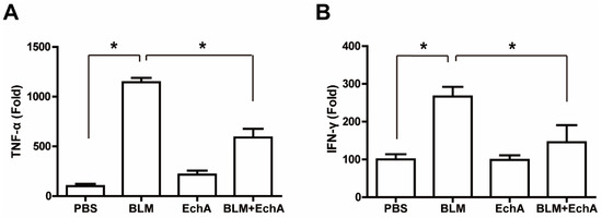 In scleroderma, inflammatory cytokines are increased in peripheral blood, which in turn activate inflammatory cells. To explore whether EchA treatment affects inflammatory cytokine levels in scleroderma mice, serum levels of TNF-α and IFN-γ were measured by ELISA in a BLM-induced scleroderma model. The serum levels of TNF-α and INF-γ in BLM-treated mice were greater than those in PBS-treated control mice. EchA co-treatment markedly attenuated the BLM-induced increase in TNF-α and IFN-γ levels (Figure 4), suggesting that EchA administration reduces systemic inflammation in BLM-induced scleroderma.