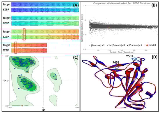 Homology modeling and validation of RBD from the Spike protein of UK SARS-CoV-2 strain. (A) Sequence alignment of target with the template (PDB ID: 6ZBP). The mutated residues (Y453F and N501Y) are highlighted in the red box, (B) QMEAN4 score of the generated model, as compared to the non-redundant set of PDB structures, (C) Ramachandran plot of the generated model, and (D) Superimposition of the generated model (blue color) on to the three-dimensional structure of the template (red color).