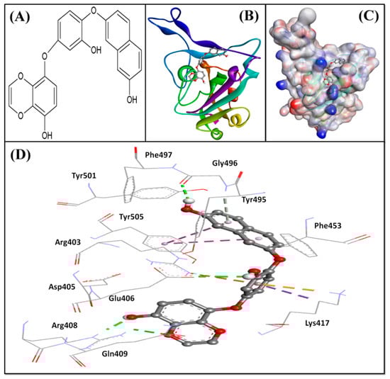 Molecular docking between DK07 and RBD of SARS-CoV-2 Spike protein in extra-precision (XP) mode. (A) 2D representation of Dieckol derivative DK07; (A,B) 2D representation showing binding of DK07 to the groove of RBD where ACE2 binds; (C) 3D representation showing binding of DK07 at the binding pocket of RBD; and (D) interaction between DK07 and RBD of Spike protein, showing the involvement of different amino acid residues and the molecular forces.