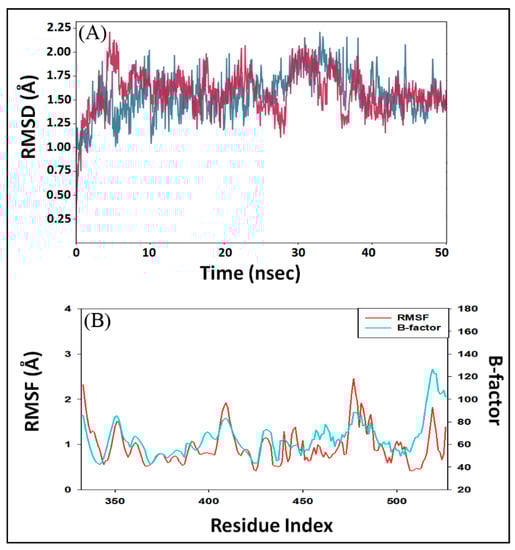 Molecular dynamics (MD) simulation of RBD–DK07 complex. (A) RMSD (root mean square deviation) of RBD alone (teal color) and in the presence of DK07 (brown color); (B) RMSF (root mean square fluctuation) of RBD in the presence of DK07 (red color), as compared with B-factor, which was determined during X-ray crystallography (teal color).