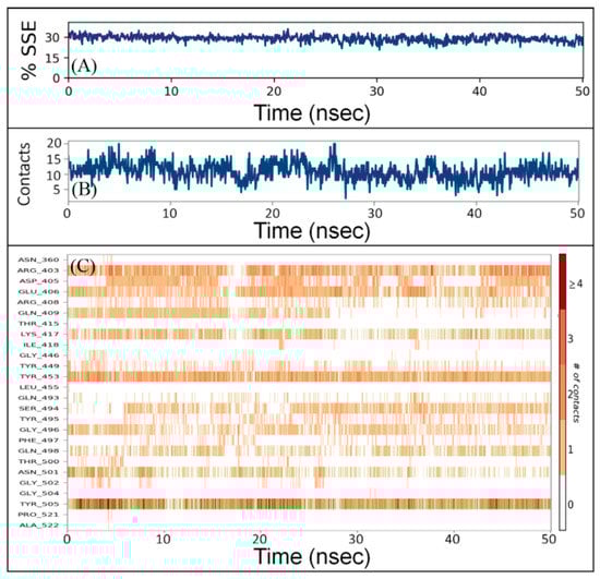 Interaction between RBD and DK07 during simulation. (A) Percentage of RBD–DK07 secondary structure element (SSE) varied during simulation, (B) the number of contacts between RBD and DK07 as a function of simulation, (C) participation of different amino acid residues of RBD in making contacts with DK07 as a function of simulation.
