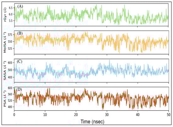 Variation in (A) rGyr (radius of gyration), (B) MSA (molecular surface area), (C) SASA (solvent accessible surface area), and (D) PSA (polar surface area) of RBD–DK07 complex during MD simulation.