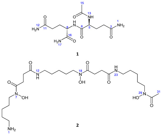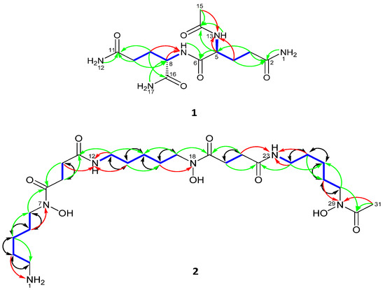 The full planar structure of 2 was assigned by interpretation of 1D (1H and 13C) in connection with extensive 2D-NMR (1H-1H COSY, 1H-13C HSQC, 1H-13C HMBC, HSQC-TOCSY and 1,1-ADEQUATE) spectroscopic data recorded in (DMSO-d6) (Table 1), and by comparing it with the previously reported data on desferrioxamine [23].