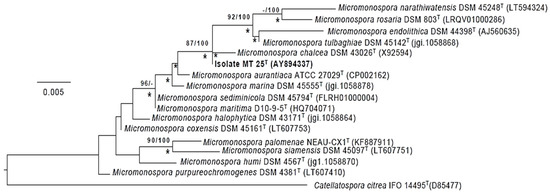 Maximum-likelihood tree based on almost complete 16S rRNA gene sequences generated using the GTR-GAMMA model showing relationships between isolate MT25T and the type strains of the closest phylogenetic neighbors. Asterisks indicate branches of the tree that were also formed using the maximum-parsimony and neighbor-forming algorithms. The numbers at the nodes are bootstrap support values greater than 60% for ML (left) and MP (right). The root of the tree was established using Catellatospora citrea IFO 14495T. The scale bar indicates 0.005 substitutions per nucleotide position.