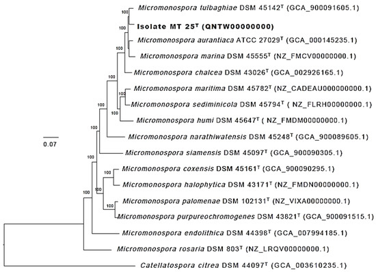 Maximum-likelihood phylogenomic tree based on 704 single copy core genes showing relationships between isolate MT25T and closely related type strains of Micromonospora species. Numbers at the nodes are bootstrap support values based on 100 replicates. GenBank accession numbers are shown in parentheses. The scale bar indicates 0.07 substitutions per nucleotide position. The tree is rooted using the type strain of Catellatospora citrea.