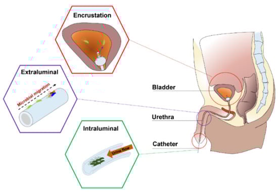 Urinary catheters are hollow, partially flexible tubes that are designed to drain urine from the bladder. The earliest use of urinary catheters can be traced back to the third century B.C., but the modern indwelling catheter, called the ‘Foley’ catheter, was designed by Frederick B. Foley in the mid-1930s [1]. To date, over 100 million urinary catheters are used worldwide per year since catheterization rates remain high at 20% in non-intensive care units and 61% in intensive care units (ICUs) [2]. Despite the care taken to avoid contamination, catheters are still susceptible to infections as they provide direct access for uropathogens from the outside environment into the urinary tract, impairing local host defence mechanisms of the bladder [3,4]. Opportunistic uropathogens (Table 1) are mainly faecal or skin microbiota from the patients that can enter the bladder through the catheter lumen (34%) or along the catheter–urethral interface (66%) causing infections and complications, such as encrustation, bladder stones, bacteriuria, pyelonephritis, septicaemia and endotoxic shock (Figure 1) [3,5,6,7]. According to the European Centre for Disease Prevention and Control (ECDC), catheter-associated urinary tract infections (CAUTIs) account for 27% of all hospital-acquired infections in developed countries, and over 1 million cases occur in the USA and Europe [1,8]. In the UK, CAUTIs cost the NHS GBP 1–2.5 billion and account for approximately 2100 deaths annually [9].