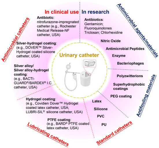 Current commercial urinary catheters can be generally classified as standard and antimicrobial catheters (Figure 2). Owing to their superior malleability, several materials used for making standard catheters include polyvinyl chloride (PVC), polyurethane (PU), silicone and latex [20]. Of these, silicone has emerged as the material of choice for urinary catheters due to distinct advantages, including excellent biocompatibility, no allergic reactions, superior chemical and thermal stability and good mechanical strength [2,26]. Morris et al. [27] compared the antiencrustation performance of 18 types of catheter and found that all-silicone urinary catheters took the longest time to encrust and block. The main reason for this lies in that the all-silicone catheter has a wider lumen, allowing a faster urine flow, which prevents the accumulation of crystalline deposits. However, recent studies demonstrated that there was no significant difference between the development of infections or bacterial adherence on silicone catheters as compared to other types of catheters [20,26,28,29].