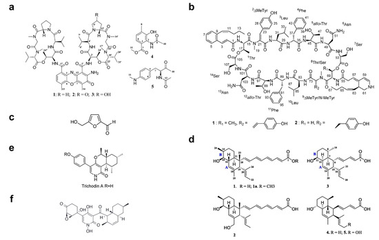 Structures of (a) actinomycins D, V and X0β [102], (b) mohangamides A and B [103], (c) 5-hydroxymethyl-2-furaldehyde (5HM2F) [104], (d) janthinopolyenemycin A and B [105], (e) trichodin A [106], and (f) didymellamide A [107].