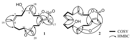 The planar structure of 1 was established according to the analysis of 2D NMR spectra as shown in Figure 2. The correlation spectroscopy (COSY) spectrum showed four partial moieties from the correlations of H-2 to H-3, H-5 via H2-6 to H-7, H2-9 via H2-10 to H-11, and H2-13 to H2-14. These partial structures were assembled by heteronuclear multiple bond correlation (HMBC) correlations from H3-17 to C-1, C-15, C-16; H3-18 to C-3, C-4, C-5; H3-19 to C-7, C-8, C-9; H3-20 to C-11, C-12, C-13; and H2-14 to C-1 and C-2. Furthermore, the NMR spectroscopic data of 1 were compared with those of the previous metabolite cherbonolide H [13] for structural elucidation. It was shown that compound 1 should possess a hydroxy group at C-5 and a 7,8-trisubstituted double bond from this NMR data comparison. According to the above evidence, the gross structure of 1 was elucidated.