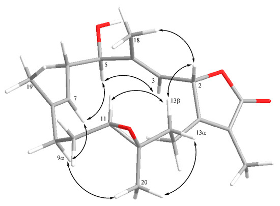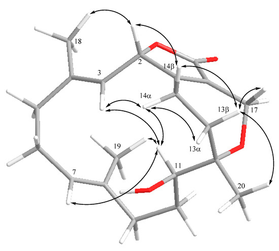 Detailed analysis of the NOESY spectrum was applied for the elucidation of the relative configuration of 2 (Figure 5). It was found the NOE correlations between H-2 and H-14β (δH 1.66, m), H-14β and H-13β (δH 1.97, m), and also H-13β and H3-20 (δH 1.02, s), suggesting the β-orientation of H3-20. On the other hand, the NOE correlations between H-3 (δH 4.50, d, J = 8.4 Hz) and H-14α (δH 2.19, m), H-14α and H-11 (δH 3.21, dd, J = 10.4, 6.4 Hz), and H-11 and H-3 were observed, indicating the α-orientation of H-11 and the downward orientation of H-3. Furthermore, the upshift resonances of C-18 (δC 18.5) and C-19 (δC 15.2) demonstrated the E geometry of C-3/C-4 and C-7/C-8. The 3J values of H-2 and H-3 (8.4 Hz) and H-10 and H-11 (10.4 Hz) were also consistent with the relative configuration as shown in Figure 5. Based on the above evidence, the relative configuration of 2 was defined as 2S*,11R*,12S*,3E,7E.