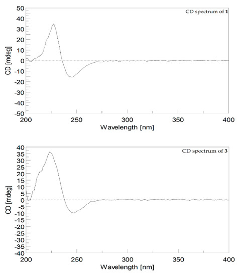 CD spectrum (1.2 × 10–4 M, MeOH) of 1 and CD spectrum (1.6 × 10–4 M, MeOH) of 3.