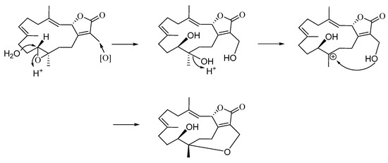 Sarcophine, the dihydrofuran-containing cembranoidal diterpene, is one of the major metabolites in the soft corals of Sarcophyton genera [21]. Bernstein et al. discovered this metabolite from the soft coral Sarcophyton glaucum in 1974 [22]. Subsequently, the absolute configuration of sarcophine was determined by Kashman et al. in 1977 [23]. Furthermore, Frincke et al. indicated that sarcophine was converted from the other 14 membered diterpene, sarcophytoxide, by auto-oxidation in 1980 [24]. Isosarcophine, an isomer of sarcophine, was proven to be converted from isosarcophytoxide via auto-oxidation and isolated from the soft coral Sinularia mayi by Kusumi et al. in 1990 [25]. It was found that isosarcophine showed significant cytotoxicities toward some cancer cell lines [25,26].