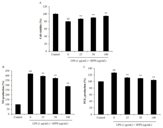 RAW 264.7 cells were seeded in 24-well plate and incubated for 24 h. Cells were treated with 25, 50, and 100 µg/mL of SFPS. After 1 h, the SFPS-treated cells were stimulated with LPS (1 µg/mL) and incubated for 24 h. After incubation, the viability of LPS-stimulated RAW 264.7 cells was determined by a MTT assay, and the production of NO was measured by a Griess assay according to protocols described previously [3,26,27].