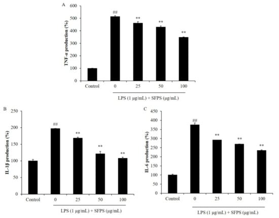 Effect of SFPS on the production levels of pro-inflammatory cytokines in LPS-stimulated RAW 264.7 cells. (A) Production of TNF-α; (B) production of IL-1β; (C) production of IL-6. RAW 264.7 cells were treated with different concentrations of SFPS (25, 50, and 100 μg/mL) and stimulated with LPS (1 μg/mL) for 24 h. The levels of pro-inflammatory cytokines were analyzed by ELISA. The experiments were conducted in triplicate and data are expressed as mean ± SE. ** p < 0.01 as compared to LPS-treated group and ## p < 0.01 as compared to control group.