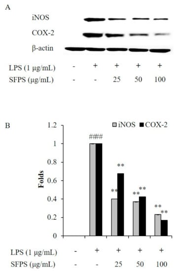 RAW 264.7 cells were treated with SFPS and stimulated with LPS. Following an incubation period of 24 h, the LPS-stimulated RAW 264.7 cells were harvested and lysed. Western blot analysis was performed according to the protocol described previously [3,5].