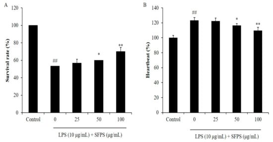 Survival rate and heartbeat of zebrafish after being treated with SFPS or/and with LPS. (A) Survival rate of zebrafish, and (B) heartbeat of zebrafish. At 7–9 hpf, the zebrafish embryos were treated with different concentration of SFPS (25, 50, and 100 μg/mL) and stimulated with LPS (10 μg/mL) until 24 hpf. The heartbeat rate was measured at 2 dpf and the survival rate was measured at 3 dpf. The experiments were conducted in triplicate and data are expressed as mean ± SE. * p < 0.05, ** p < 0.01 as compared to LPS-treated group and ## p < 0.01 as compared to control group.
