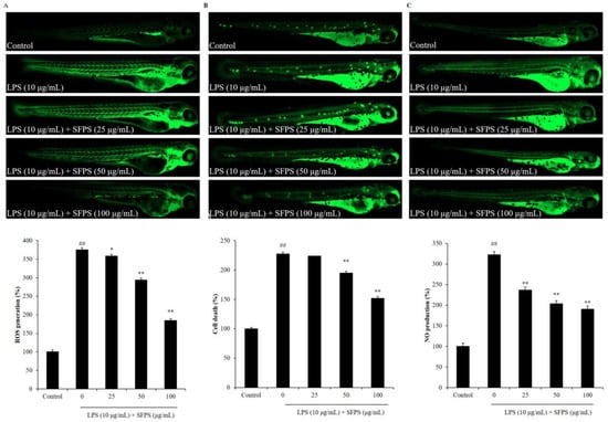 In the present study, the effect of SFPS on survival rate decreasing, heartbeat disorder, and inflammatory response in LPS-stimulated zebrafish was investigated. As shown in Figure 4A, the survival rate of LPS-treated zebrafish was significantly decreased. However, the survival rates of zebrafish treated with SFPS were remarkably increased in a dose-dependent manner (Figure 4A). In addition, LPS significantly stimulated heartbeat disorder, but the heartbeat disorder of zebrafish was effectively improved by SFPS treatment. Furthermore, the levels of reactive oxygen species (ROS), cell death, and NO in LPS-treated zebrafish were significantly increased compared to the zebrafish non-treated with LPS (Figure 5). Whereas, the levels of ROS, cell death, and NO of LPS-treated zebrafish were effectively reduced by SFPS in a dose-dependent manner (Figure 5). These results demonstrated that SFPS could effective suppresses LPS-stimulated inflammatory response in vivo in zebrafish.
