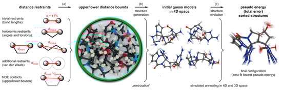 Workflow of fc-rDG/DDD calculations: (a) based on the known molecular constitution in an arbitrary configuration (and conformation), a set of holonomic intramolecular distances including bond lengths (1,2-distances), angles (1,3-distances), and torsions (1,4-distances), excluded van der Waals volumes, and NOE/ROE-derived distance limits between all atom–atom pairs defines boundary conditions for computing molecular structures similar to using a model construction kit. (b) Using this basic scaffolding information, initial guess structure models of arbitrary configuration and conformation are generated by a “metrization” procedure in 4D space. (c) These models are subsequently refined through an automated sequence of simulated annealing steps in 4D and 3D space under the restraints of experimental NOE/ROE distance limits, by which finally the correct configuration evolves as the best-fit structures of the lowest pseudo energy (total error).