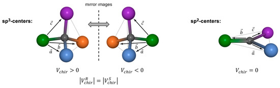 Definition of chiral volumes for sp3-type (left) and sp2-type (right) atomic centers in DG/DDD simulations as pseudo scalar triple products . The sign of encodes the absolute configuration of tetrahedral centers, whereas vanishes for planar structure fragments. Although may serve as a chiral restraint in DG/DDD calculations, omitting these chiral restraints for certain prochiral or stereogenic centers by deleting them from the list of the chiral volumes allows these centers to “float” (i.e., change their configuration) within the calculation (floating chirality).