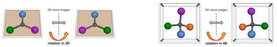 In contrast to rMD simulations, DG relies solely on experimental data, and all stereogenic centers are allowed to adopt their relative configuration in accordance with the experimental data and thus, remove any intrinsic bias imposed on the results by not implementing physical force-fields of any type. As already mentioned, another important aspect of the DG/DDD approach is that all structure models are first generated in four-dimensional (4D) space before these are transferred into “real” 3D space (Figure 1, Step b). The extra dimension not only provides additional degrees of freedom to assemble structures of different configurations and conformations within the limits of the distance bounds, but also efficiently eliminates “energy” barriers for configurational inversions in the DDD step [33,34]. By analogy with 2D chiral objects that can be transformed into each other through a rotation in higher dimensions (3D), the configuration of 3D chiral objects can be inverted by rotations in 4D (Figure 3).