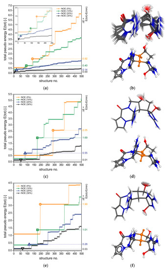 (a) Plot of the total “pseudo energy” of ranked rDG structures for 1a, showing the first 500 out of 1000 structures generated (KNOE = 50.0 Å−2). The plot shows the results for four fc-rDG/DDD calculations with different ranges for the ROE-derived distance restraints: ±5% (orange), ±10% (green), ±20% (blue), and ±30% (black). The bold printed symbols in the corresponding colors highlight the first wrong structure, respectively (±5%: #138, ±10%: #93, ±20%: #21, and ±30%: #3). The dashed lines indicate the corresponding values, which are given on the right side of the plot. The inset plot shows the “energy” steps in detail (first 250 structures). (b) Molecular structures for 1a showing the superposition of all DG structures identified up to the first wrong configuration (92 structures) of the ±10% calculation; the DG best-fit (lowest pseudo energy) structure is plotted below, displaying the correct configuration of 1a. (c,d) Similar plot as above for compound 1b and (e,f) compound 1c (first wrong structures of 1b: ±5%: #290, ±10%: #174, ±20%: #84, ±30%: #53, and 1c: ±5%, #196, ±10%: #175, ±20%: #114, and ±30%: #66; number of superimposed structure: 1b: 173 and 1c: 174).